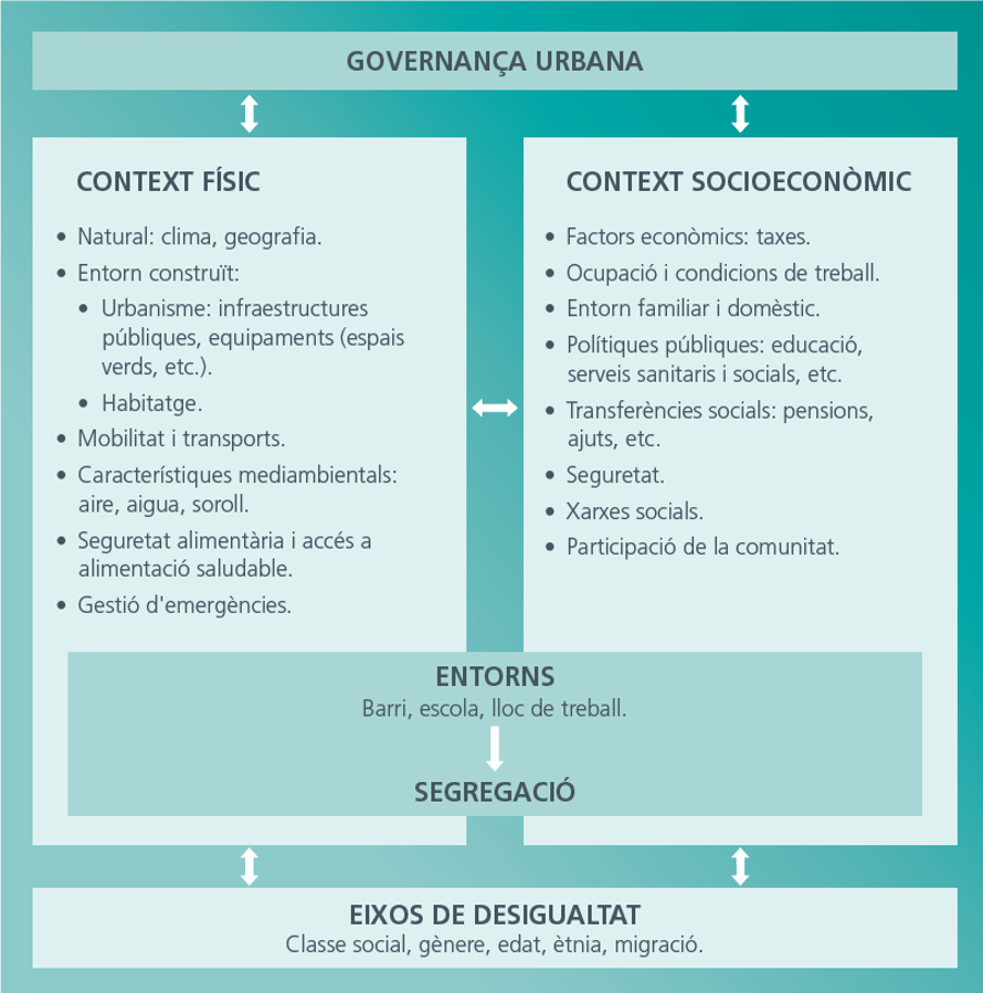 Si voleu conèixer més sobre el marc conceptual podeu llegir (C. Borrell, M. Pons-Vigués, J. Morrison, et al. Factors and processes influencing health inequalities in urban areas.J Epidemiol Comm Health., 67 (2013), pp. 389-391).