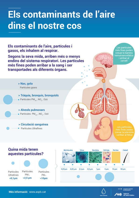 Infografia sobre com els contaminants de l’aire (gasos i partícules) entren al nostre cos, en funció de la seva mida. Les partícules més petites arriben al torrent sanguini i creuen la placenta i la barrera hematoencefàlica arribant al fetus i al cervell.