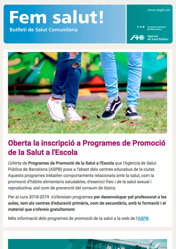 Aprofitem per informar-vos que la inscripció a programes de promoció de la salut a les escoles de l’Agència de Salut Pública de Barcelona, roman oberta fins a finals d’octubre.