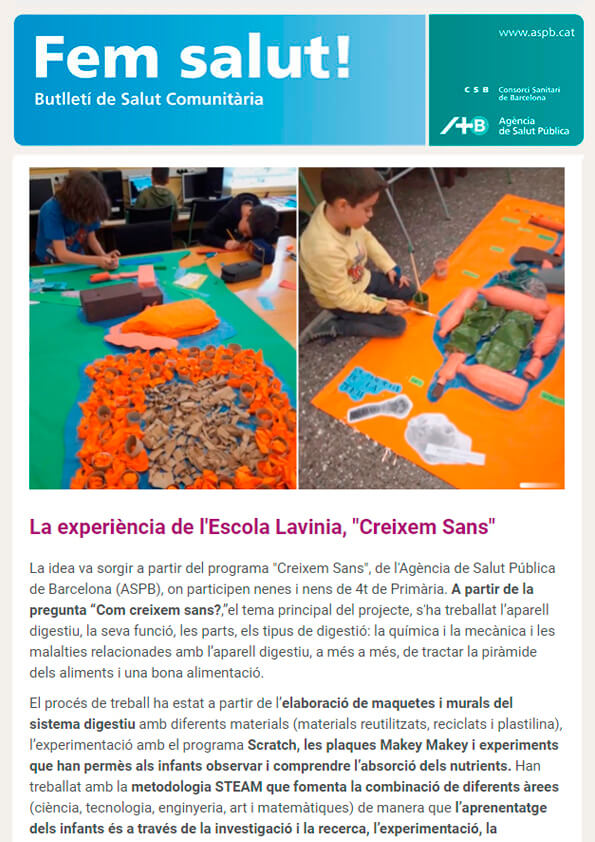 En aquest butlletí trobareu l’experiència de l’Escola Lavinia amb l’aplicació del programa “Creixem Sans” a 4t de primària, a través de diferents metodologies educatives. A més, durant aquest curs a l’Institut Escola Trinitat s’ha engegat una iniciativa comunitària i multidisciplinària per tal de promoure la salut bucodental. També us informem del nou programa municipal “Escola Respira” que recull les actuacions per millorar la qualitat de l’aire als entorns escolars així com accions de sensibilització a tot el col·lectiu escolar.