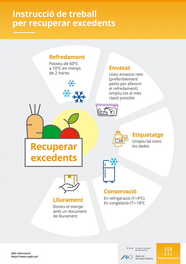 Hi trobareu un document amb models per a una donació segura i aquesta infografia remarca tot allò que és important per garantir la recuperació segura dels excedents dels menús sobrants. La podeu penjar en un lloc visible de la cuina.