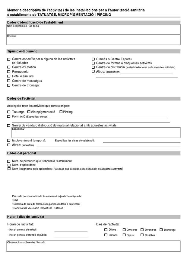 Memòria descriptiva de l’activitat i de les instal·lacions per a l’autorització sanitària de l’establiment d’establiments de tatuatge, micropigmentació i pircing.