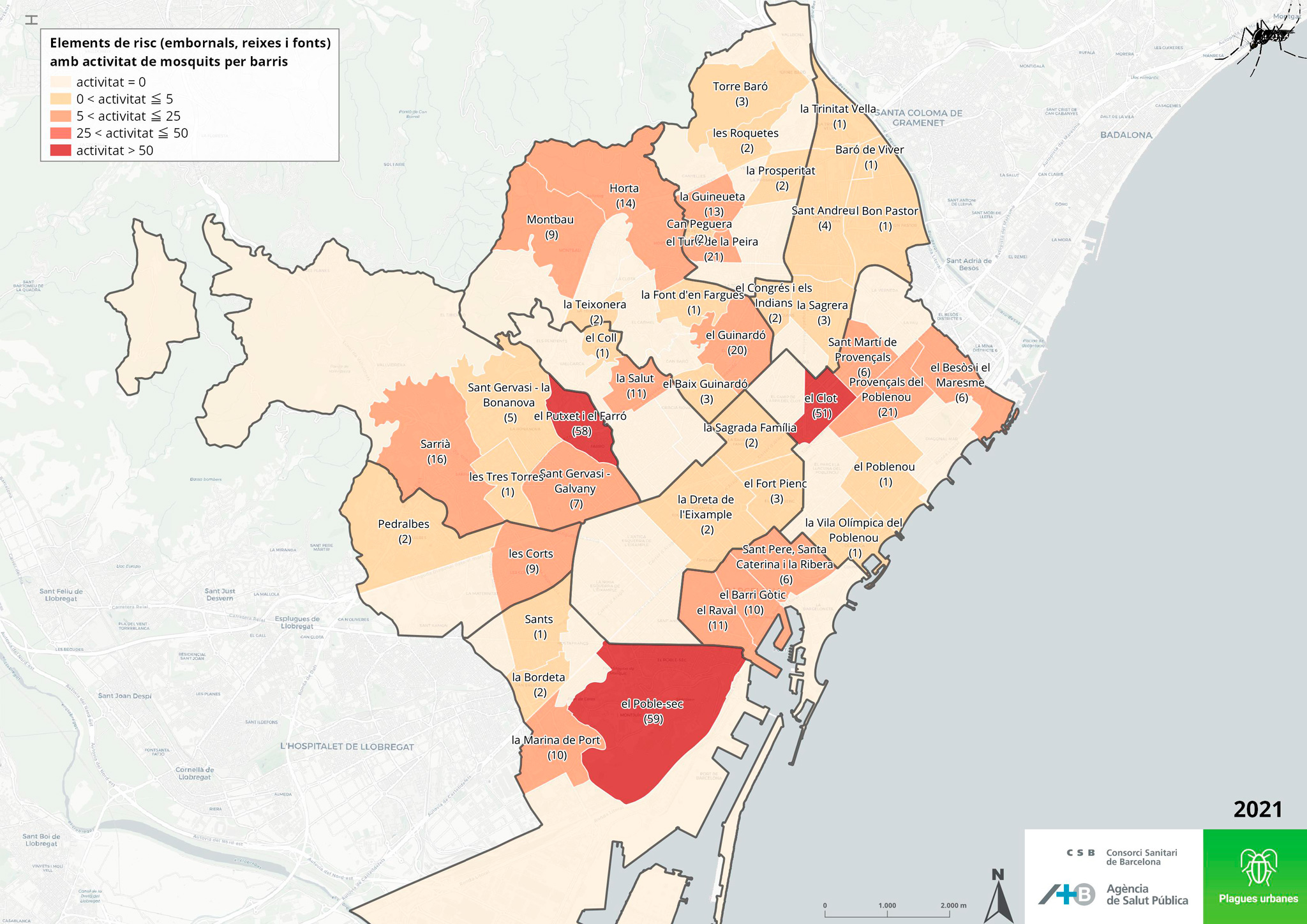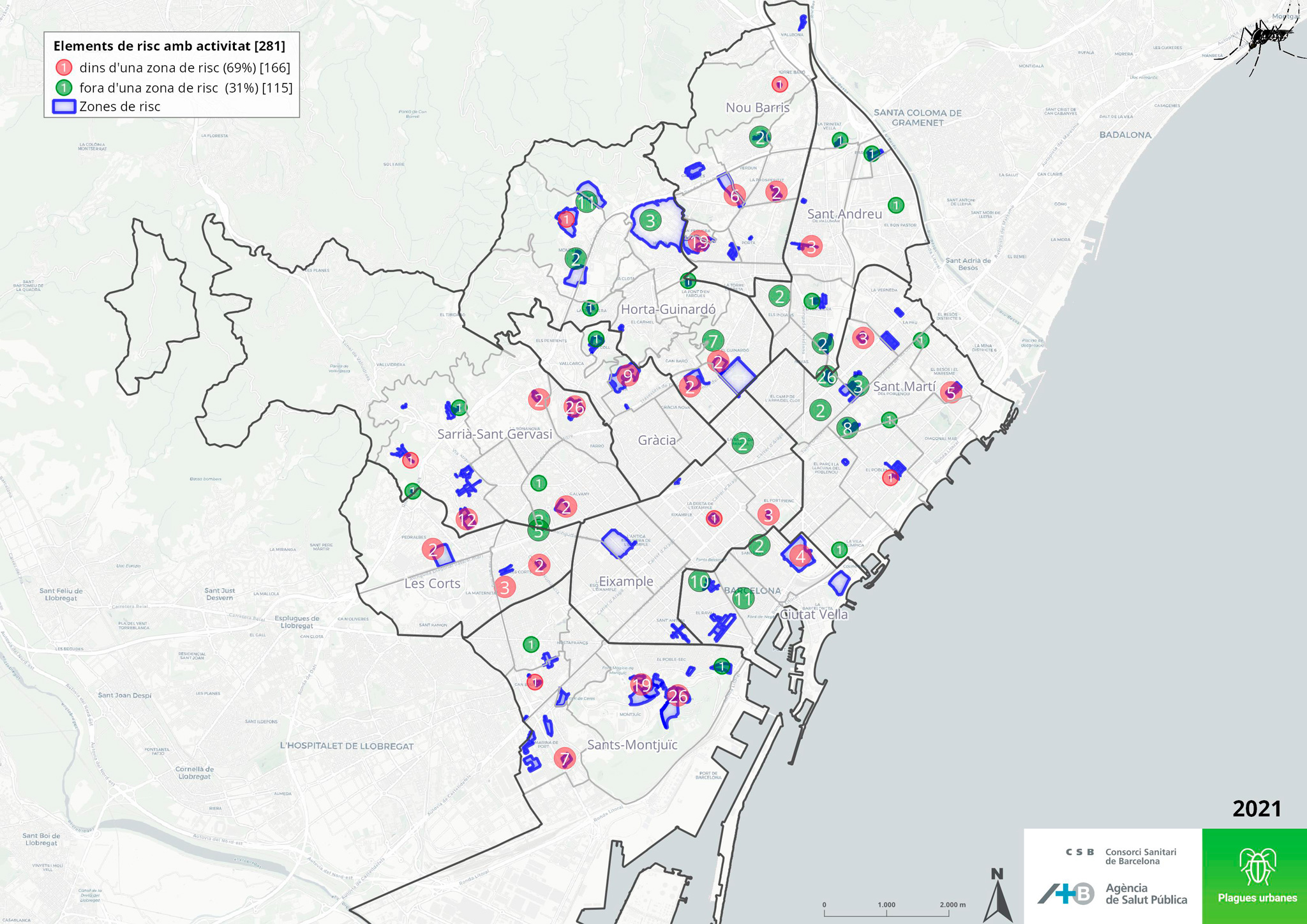 El 2021 es van efectuar 26.973 revisions a elements de risc (embornals, fonts…), fruit de totes les tasques d’inspecció derivades de les diferents línies de treball. Es va detectar activitat en 406 d’aquests elements i es van efectuar 4415 actuacions larvicides per controlar la seva proliferació. El mes de juny va ser el que va concentrar més activitat en els elements de risc, i els barris de Poble Sec, el Putxet i el Farró i el Clot els més afectats territorialment.