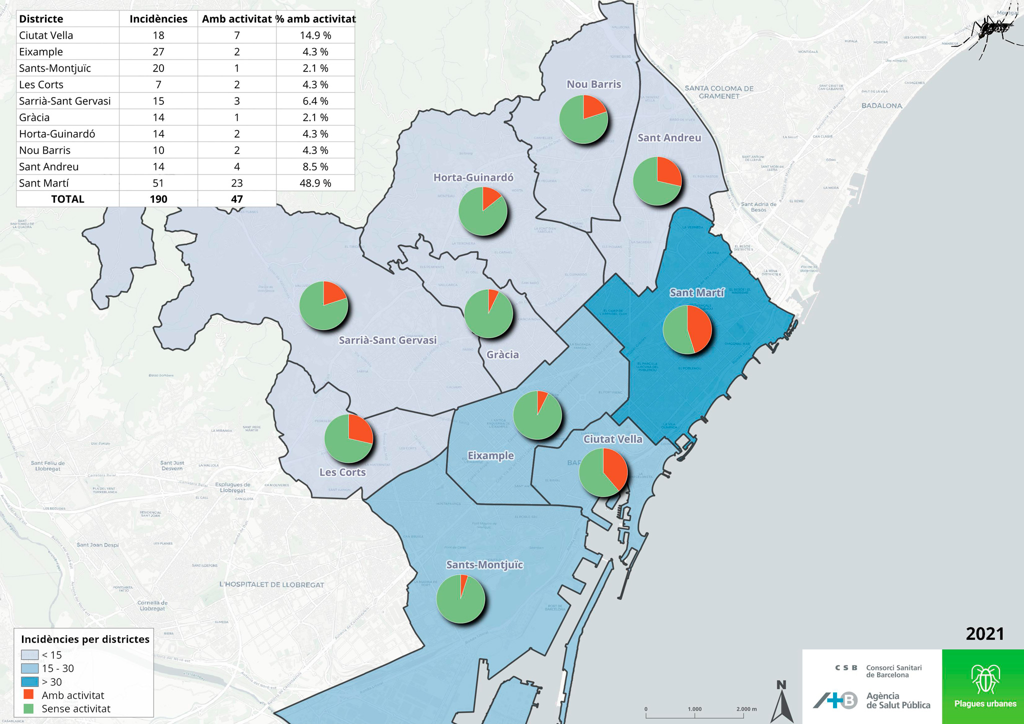 El 2021, l’ASPB va rebre i atendre 190 incidències comunicades per la ciutadania a través dels diferents canals de l’Ajuntament de Barcelona. L’activitat detectada arran de les inspeccions efectuades es va situar al voltant del 24%. Aquesta baixa activitat es fonamenta en el fet que els focus de cria es troben majoritàriament a les propietats privades, aspecte que dificulta el control i posa de manifest la importància de la col·laboració publicoprivada.