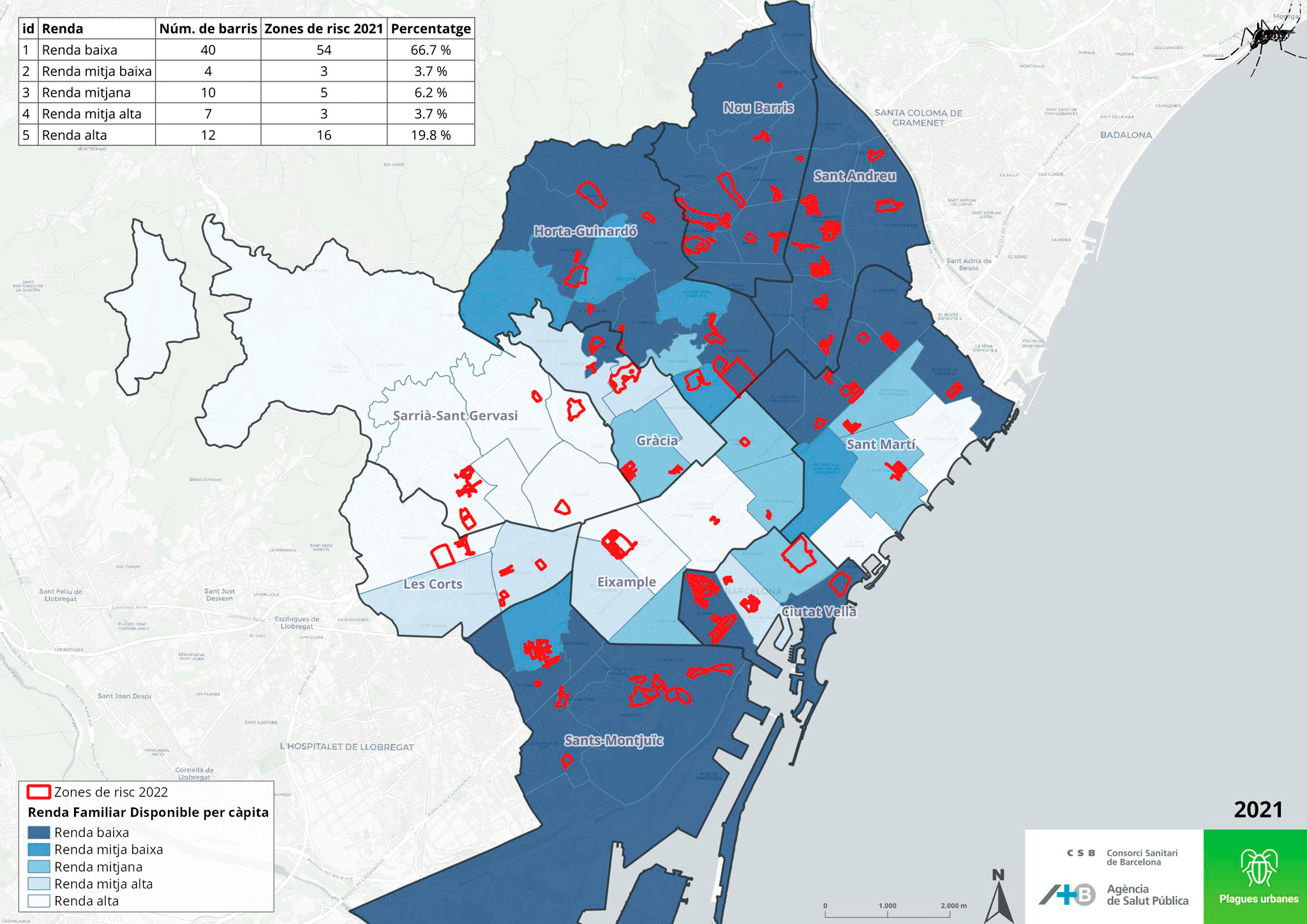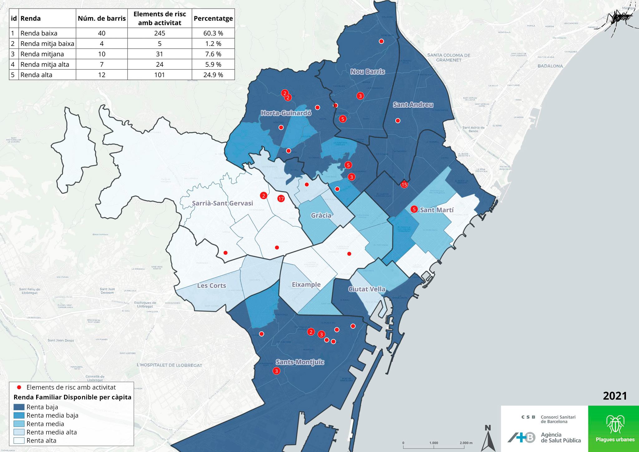 Així, el 2021 s’ha mostrat com es distribueix l’activitat de mosquits en els diferents elements de risc a la ciutat segons la renda familiar disponible, un determinant clau per a la salut de les persones. Els resultats indiquen que el 59% de l’activitat es distribueix en àrees de rendes baixes. Aquesta dada és rellevant donat que la disponibilitat de recursos econòmics pot condicionar la realització de millores en els habitatges, l’accessibilitat a repel·lents o la col·locació de mosquiteres, fet que pot generar dificultats per reduir la presència de mosquits i evitar el seu impacte negatiu en la salut de les persones.
