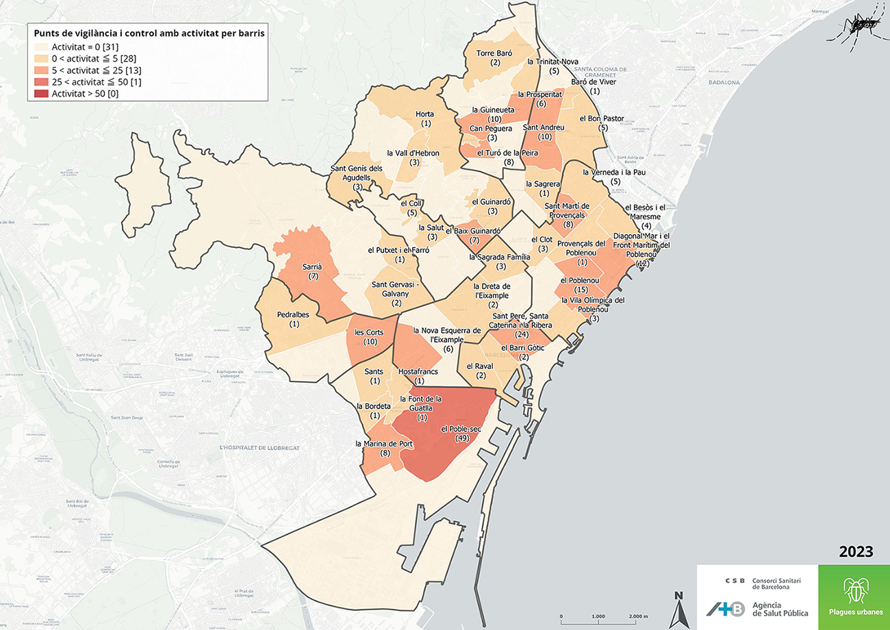 El 2023, l’ASPB va rebre i atendre 143 incidències comunicades per la ciutadania a través dels diferents canals de l’Ajuntament de Barcelona. L’activitat detectada arran de les inspeccions efectuades es va situar al voltant del 11%. Aquesta baixa activitat es fonamenta d’una banda en la baixa pluviometria del 2023 i en les mesures contra la sequera (buidatge de fonts), la qual cosa va representar tenir bona part dels focus de cria de la via publica secs, sense aigua. No obstant això, hem de tenir en compte que els focus de cria es troben majoritàriament als espais exteriors de les propietats privades (patis, terrasses, jardins…), cosa que dificulta el control i posa de manifest la importància de la col·laboració publico-privada.