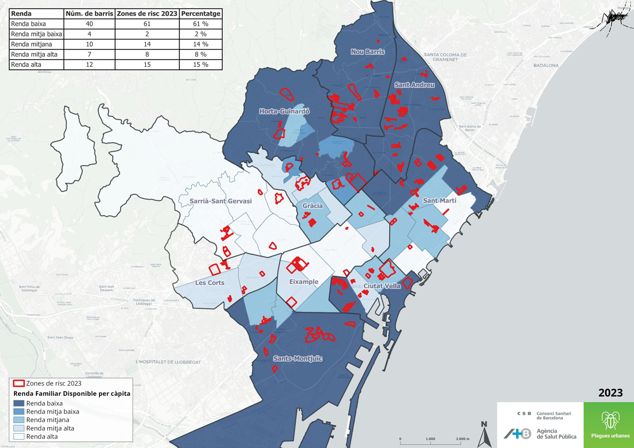Així, el 2023 s’ha mostrat com es distribueix l’activitat de mosquits en els diferents punts de vigilància i control a la ciutat segons la renda familiar disponible, un determinant clau per a la salut de les persones. Els resultats indiquen que el 60% de l’activitat es distribueix en àrees de rendes baixes. Aquesta dada és rellevant donat que la disponibilitat de recursos econòmics pot condicionar la realització de millores en els habitatges, l’accessibilitat a repel·lents o la col·locació de mosquiteres, fet que pot generar dificultats per reduir la presència de mosquits i evitar el seu impacte negatiu en la salut de les persones.