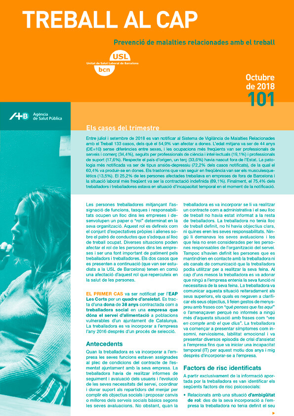 Aquest número ofereix un resum dels casos notificats el tercer trimestre de 2018 al sistema de vigilància de malalties relacionades amb el treball i una descripció de dos casos estudiats a la Unitat de Salut Laboral de Barcelona, des de dues empreses diferents, diagnosticats d’un trastorn d’ansietat relacionat amb un problema amb el seu rol a l’empresa.