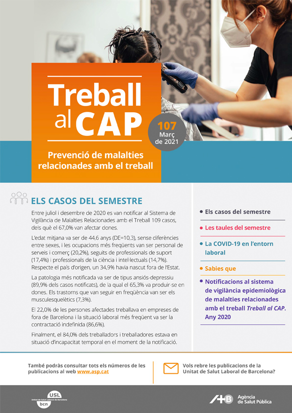 Resum dels casos notificats el segon semestre de 2020 al sistema de vigilància de malalties relacionades amb el treball i descripció dels casos notificats durant l’any 2020. Així mateix s’ofereix un resum de les actuacions adreçades al control de la COVID-19 en l’entorn laboral, al llarg del darrer semestre de 2020, i informació relativa al rol dels Serveis de Prevenció de Riscos Laborals davant l’exposició laboral al nou coronavirus SARS-CoV-2.