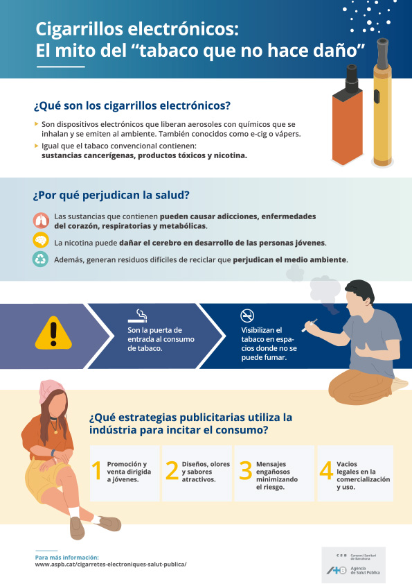 “Los cigarrillos electrónicos: el mito del ‘tabaco que no hace daño’” es una infografía que tiene como objetivo informar sobre la composición y los riesgos asociados a los cigarrillos electrónicos, así como desenmascarar las estrategias de la industria para fomentar su consumo, especialmente entre la población joven. Esta infografía complementa el informe “Los cigarrillos electrónicos: situación actual y propuestas de actuación”, recientemente publicado por la Agència de Salut Pública de Barcelona con motivo del Día Mundial Sin Tabaco.