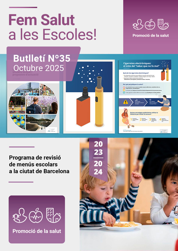 ¡Se ha publicado el Boletín número 35 de Fem Salut en las escuelas! En este número se comparte un informe de la ASPB sobre el consumo de cigarrillos electrónicos y una infografía sobre su composición, los riesgos asociados a su consumo y las estrategias de la industria para fomentar su uso, especialmente entre la población joven. También incluye el acceso a la web sobre enfermedades transmisibles, elaborada por el servicio de epidemiología de la ASPB, con información en formato FAQ sobre las más frecuentes en la infancia. Se explican además los resultados de la evaluación del proyecto “Comedores escolares más sanos y sostenibles” y del Programa de revisión de menús escolares en la ciudad. Por último, se incluye información sobre el programa «Cara y Cruz» para prevenir la adicción al juego y sobre las inscripciones a los programas escolares de la ASPB.