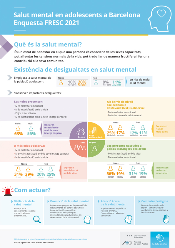 La Agència de Salut pública de Barcelona ha elaborado un informe sobre la salud mental en adolescentes en Barcelona que analiza los resultados obtenidos en la última encuesta de Factores de Riesgo en Estudiantes de Secundaria (FRESC) 2021. En esta infografía encontrará un resumen de los datos y conclusiones principales.