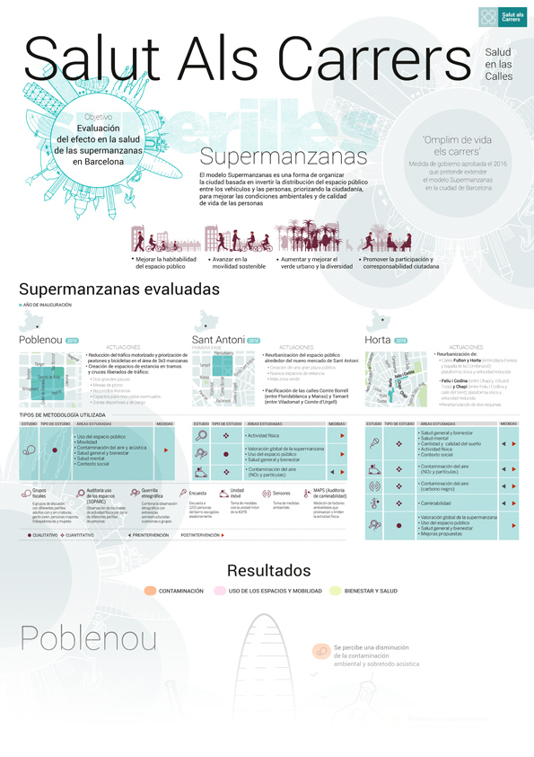 La evaluación del programa «Salut als Carrers» sobre los efectos medioambientales y en la salud de las Supermanzanas en los barrios Poblenou, Sant Antoni y Horta mostra muestra, en general, beneficios en el bienestar y la salud emocional, mejor descanso, menor contaminación acústica y atmosférica y mayor socialización. Se trata de un entorno más tranquilo, cómodo y seguro que facilita la interacción entre vecinos, y favorece las redes sociales.