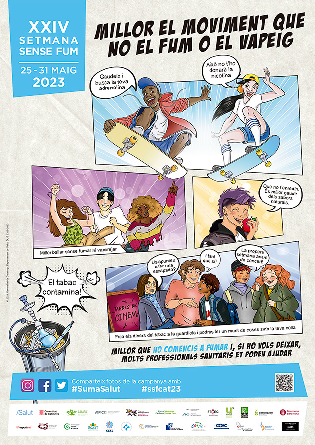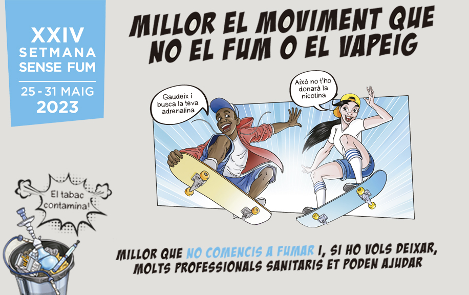 Del 25 al 31 de mayo se celebra la XXIV Semana Sin humo. El objetivo de esta iniciativa es sensibilizar a la población de la importancia que tiene para la salud el no iniciarse, abandonar el consumo de tabaco y poder disfrutar de un ambiente libre de humo y de residuos del tabaco. El lema escogido este año es «Mejor el movimiento que no el humo o el vapeo». La Agència de Salut Pública de Barcelona (ASPB) se suma a la celebración y anima a participar activamente en la campaña.