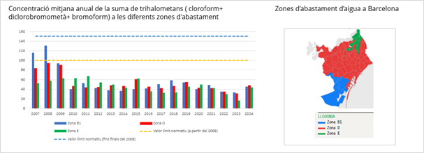 En aquest escenari, l’ASPB ha mantingut una vigilància intensiva de la qualitat de l’aigua de consum per assegurar el compliment de la normativa. L’informe destaca positivament que tot i la reducció de recursos hídrics s’ha mantingut una bona qualitat de l’aigua de beure en la xarxa de subministrament de la ciutat. Un dels paràmetres que es poden veure alterats per la situació de sequera són els trihalometans, que gràcies a les grans inversions fetes anys enrere a Barcelona es mantenen estables i per sota dels límits normatius de protecció de la salut.