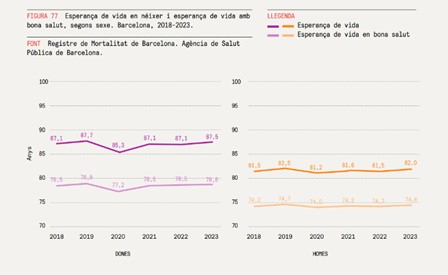 Segons el Registre de Mortalitat de Barcelona, l’any 2023 l’esperança de vida en néixer era de 87,5 anys per a les dones i de 82 anys per als homes. Aquestes xifres són molt semblants a les del 2019, i indiquen que la ciutat ha recuperat l’esperança de vida després de l’impacte de la pandèmia. La mortalitat global a Barcelona es va mantenir estable l’any 2023 i es van recuperar també els nivells d’abans de la pandèmia, confirmant-se la tendència a la baixa dels darrers anys. Les malalties cardiovasculars i els tumors van continuar sent les principals causes de mort.