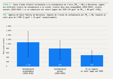 Pel que fa a l’entorn físic, l’informe de l’ASPB destaca que la millora de la qualitat de l’aire a la ciutat ha fet reduir també els casos de mortalitat i malaltia atribuïbles a la contaminació. En concret, segons l’informe, els nous casos d’asma infantil atribuïbles a aquesta causa s’han reduït un 28%, passant de 1.100 en la contaminació prepandèmia (2018-19) a 800 en l’actual (2020-2024). Tanmateix assenyala, que si Barcelona arriba a assolir els límits de contaminació de l’aire que es plantegen pel 2030, encara es reduirien un 40% més.