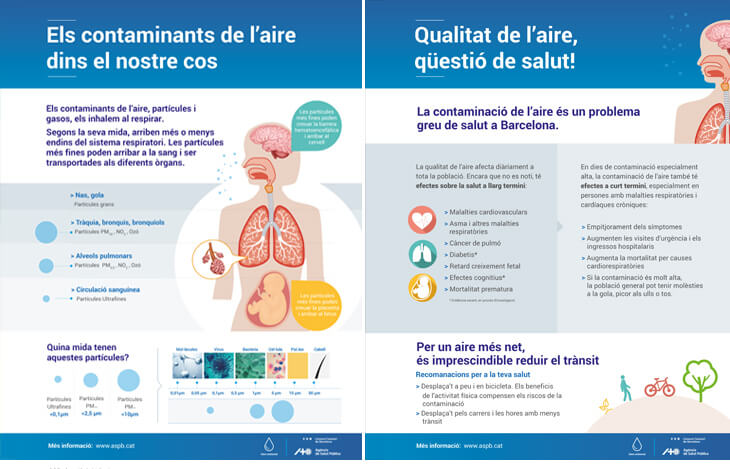 L’ASPB fa una nova aportació per a difondre com afecta la contaminació de l’aire a la salut de les persones. Des del Servei de Qualitat i Intervenció Ambiental i del Servei de Sistemes d’Informació Sanitària s’han preparat cinc pòsters divulgatius que es poden consultar i que aborden aquesta qüestió. Aquests elements gràfics, que es van donar a conèixer durant la Setmana de la Mobilitat Sostenible i Segura 2017, repassen què fan els contaminants dins el nostre cos, quins efectes tenen a llarg i curt termini, quina és la població exposada, com és la xarxa de vigilància, i què sabem en seguretat vial i transport actiu.